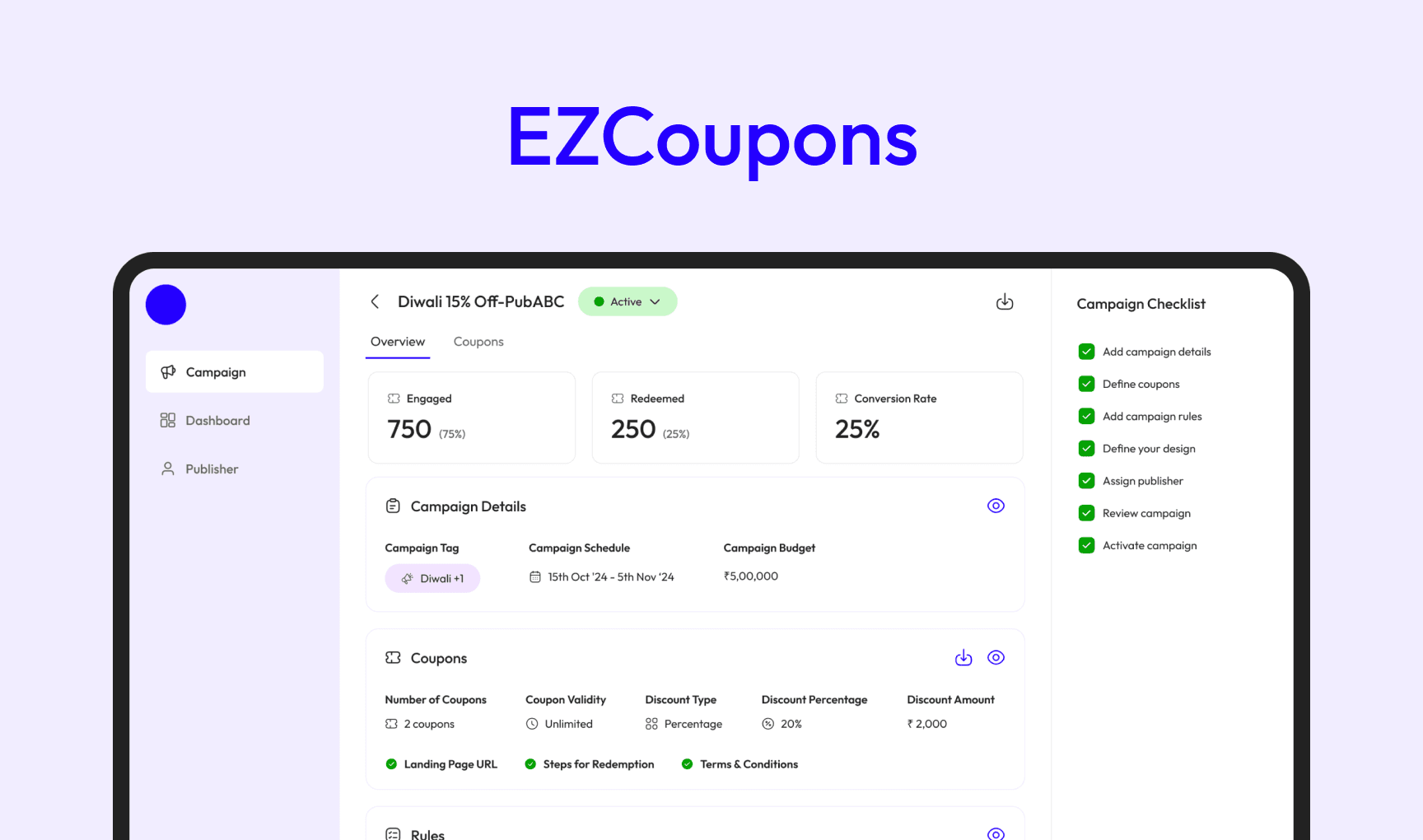 Detailed Campaign Overviews to get a clear understanding of each campaign at a glance. Partners can view essential details such as campaign objectives, target audience, coupon types, distribution channels, and redemption rules. This transparency helps partners choose the campaigns that best align with their marketing goals.